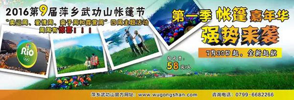 此外,2016第九屆萍鄉(xiāng)武功山帳篷節(jié)第二季·云中露營季,熒光電音節(jié)!——江西鄉(xiāng)村旅游音樂節(jié)暨武功山國際帳篷節(jié)?云中草原熒光電聲音樂會將再次唱響武功山巔,屆時,將有一場集音樂與熒光于一體的音樂盛宴華麗綻放,除了傾情邀請知名搖滾明星現(xiàn)場助陣外,還將組織多種表演形式,營造大音樂氛圍,為武功山帳篷節(jié)打造出一個更全面,更緊貼世界潮流的國際形象。